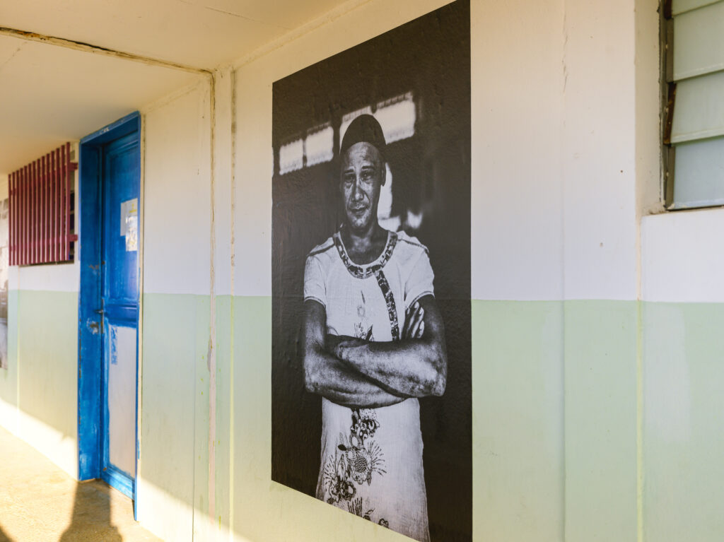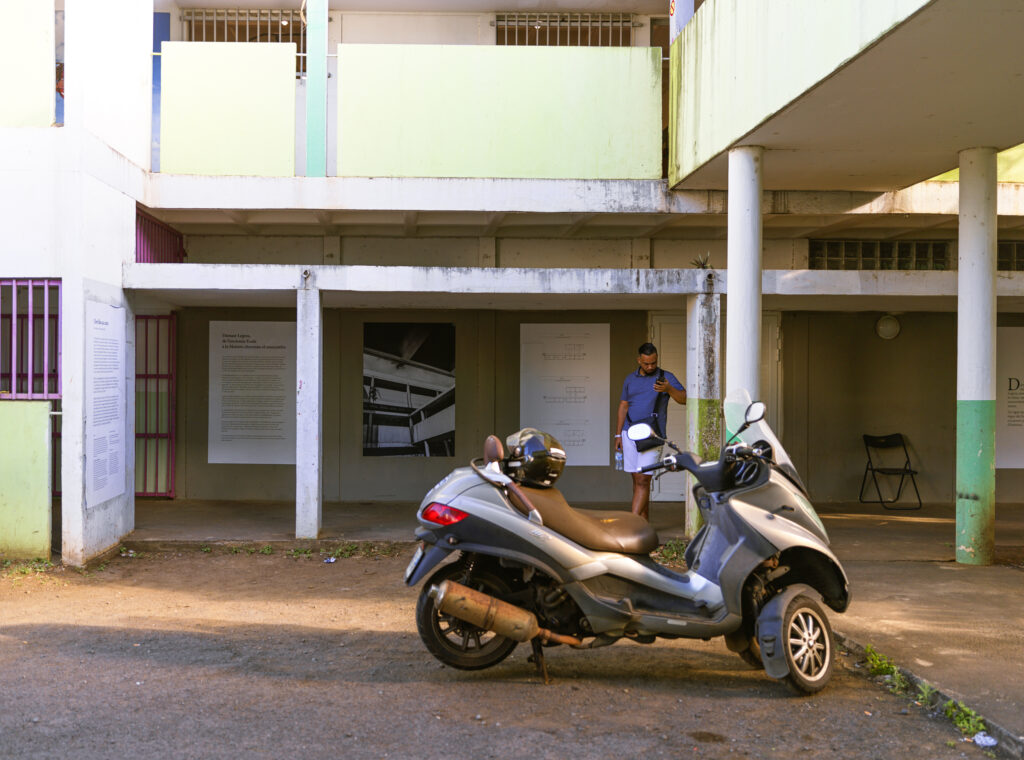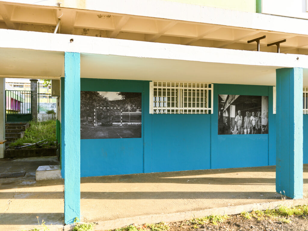 « Deux bâtisses vertes se font face, la plus imposante avec vingt-quatre classes sur trois niveaux, et l’autre regroupant trois salles à l’étage, et au rez-de-chaussée le bureau d’autrefois occupé par un studio d’enregistrement et de vidéo ; et les sanitaires. Deux passerelles relient et soudent un ensemble luttant contre la dégradation du temps, sur les toits la pluie s’infiltre, les nacos vétustes laissent entrer le vent, la peinture s’écaille. Les murs sont vierges de graffitis, excepté la figure radieuse d’un zarboutan des lieux s’envolant. Au pied de ces deux bateaux aux multiples capitaines, une bande de terre gazonnée nourrit bananier, manguier, jamelonier, goyavier, ou encore combava et caloupilé, à l’image des jardins créoles de nos grands-mères. »