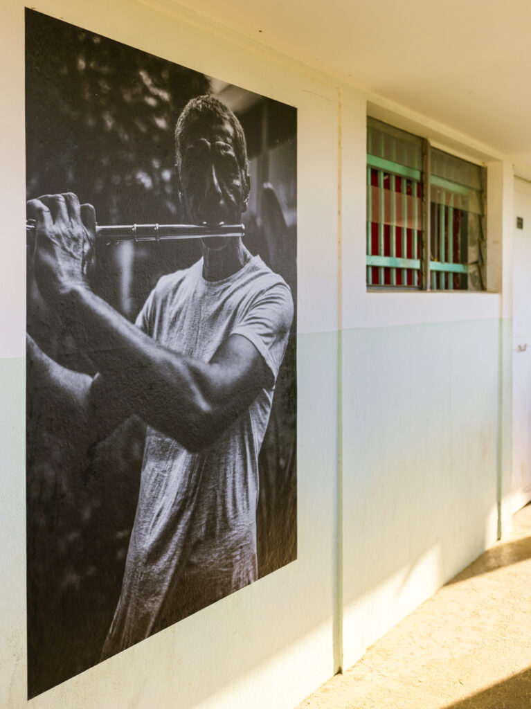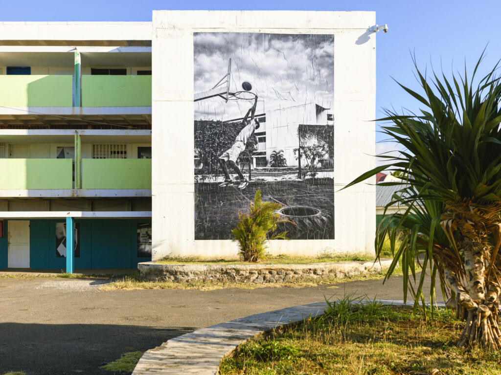 « Dans la cour, sur l’îlot central trône un badamier offrant ses branches aux oiseaux, à côté de nombreux véhicules immobiles sur l’asphalte. Le long de la clôture, badamier, flamboyant et tamarin de l’Inde ombragent Le Chaudron bétonné. Un métallique sépare l’école du gymnase Fontano. Il suffirait d’abattre cette frontière pour une cohésion avec le plateau noir où parfois sont organisées des danses des communautés fréquentant l’espace. »